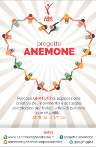 Con la collega psicologa e danzaterapeuta Laura Elke D’Apolito e attraverso il bando Socialmente 2 del CESV Lazio, abbiamo sviluppato, con AISA Lazio Onlus e un’ampia rete di associazioni sul territorio, il progetto Anemone, completamente gratuito per gli utenti, per la promozione del benessere di familiari di persone disabili attraverso la realizzazione di percorsi di gruppo che integrano un lavoro corporeo con spazi verbali di riflessione in due distretti Socio Sanitari della provincia di Latina.