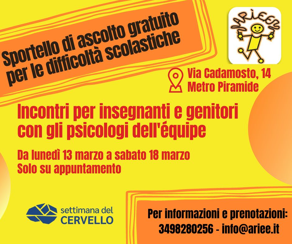 In occasione della Settimana del Cervello 2023, con altri professionisti di Ariee APS, mi sono reso disponibile per svolgere, nel corso del periodo che va dal 13 al 18 marzo, degli incontri gratuiti destinati ad insegnanti e genitori in merito ai Disturbi dell’apprenmdimento.