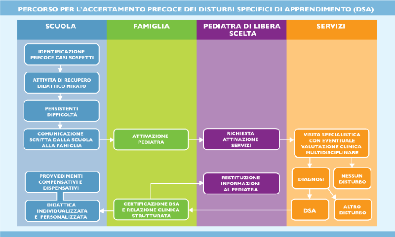 Gli alunni della scuola primaria che presentano difficoltà persistenti anche dopo il percorso di potenziamento didattico avviato per almeno 6 mesi, vedranno la loro situazione segnalata alla famiglia, con relazione scritta, su cui il pediatra di libera scelta valuterà un eventuale invio ai servizi sanitari individuati per la diagnosi e la certificazione di DSA.